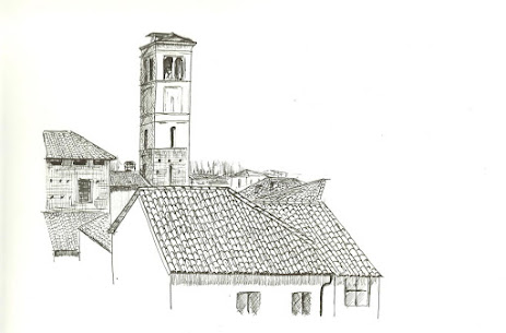 Racconigi, Madonna della porta church. In the middle the ancient gate of the city. Behind, the S. Maria maggiore belltower. (pen on paper D. Costamagna)